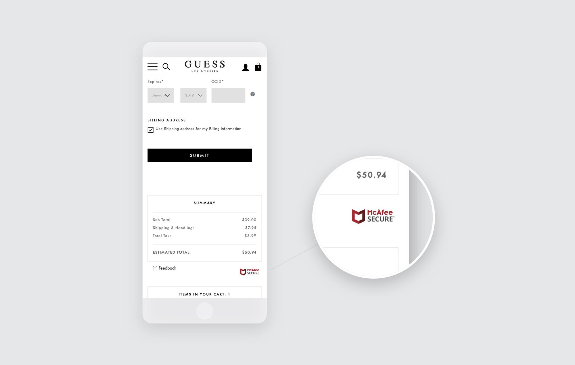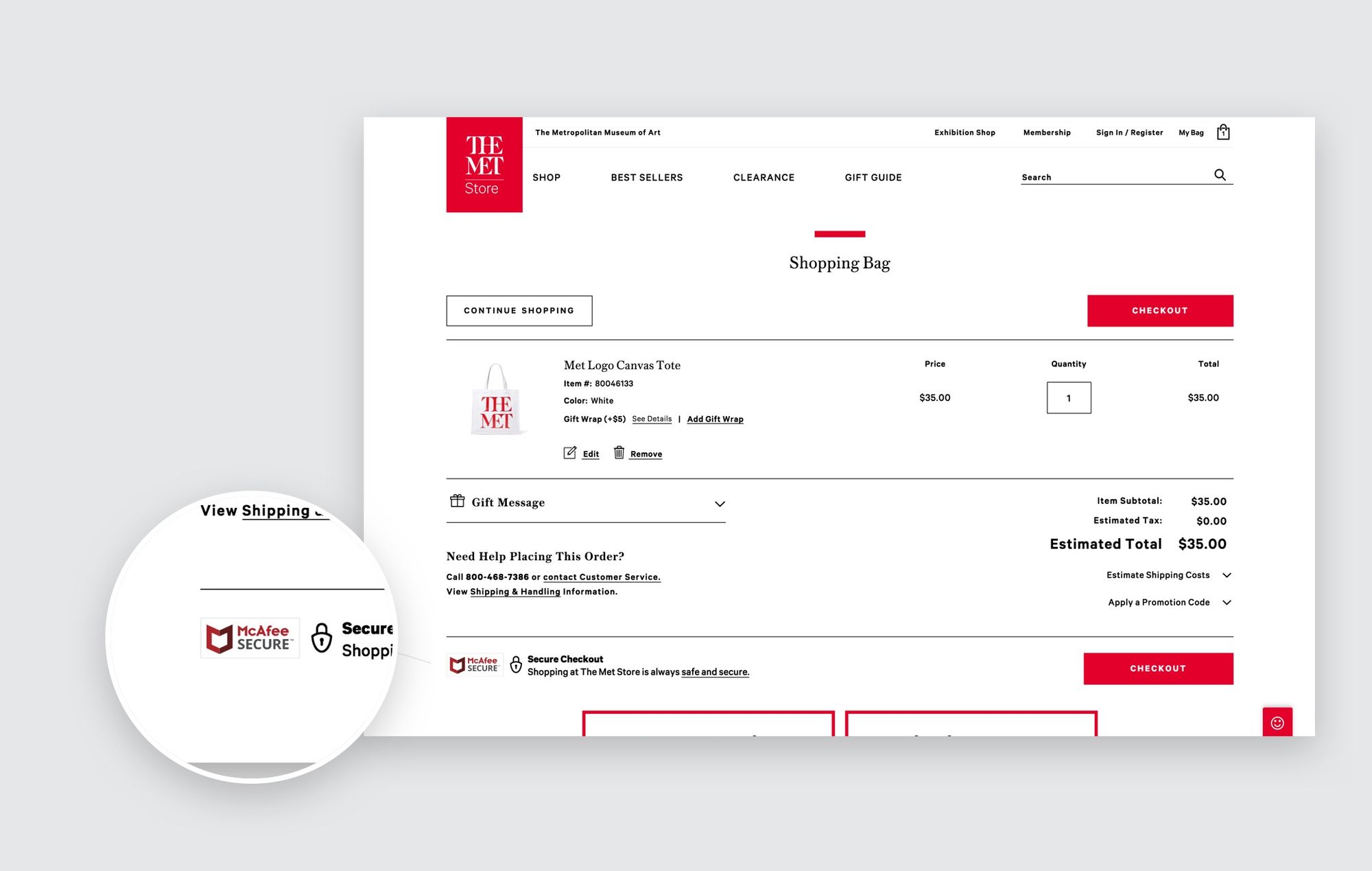 The Met uses the same inline trustmark as Party City, but in a slightly different place. They put it in the cart, before the consumer has entered the checkout. Most importantly, they pair it with text that expressly lets the customers know they're safe—letting the McAfee SECURE brand and their words work together.