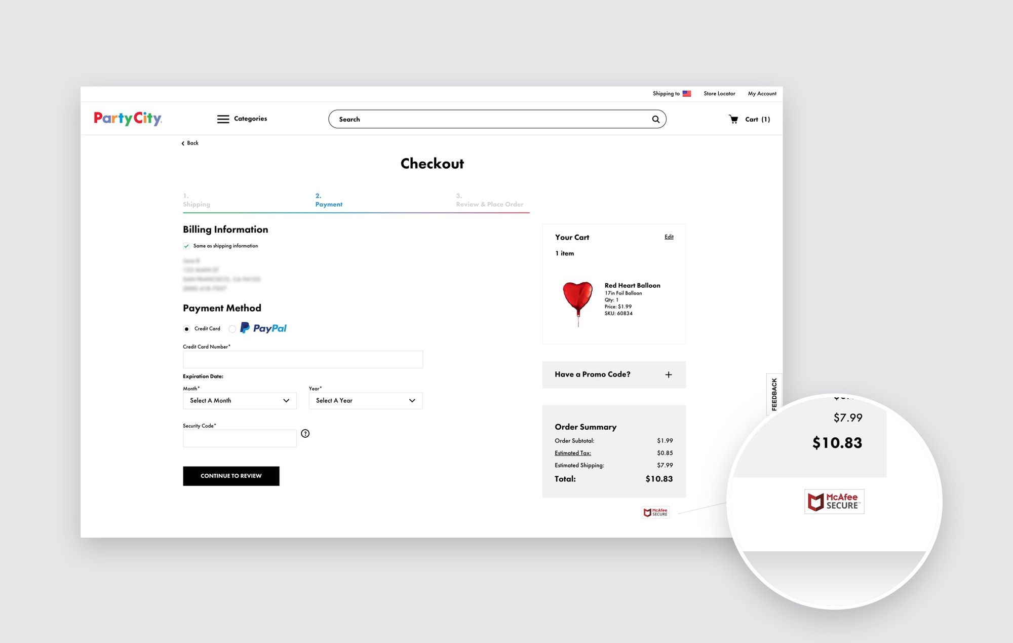 Take a look at the checkout page of Party City, a chain that sells party supply items: