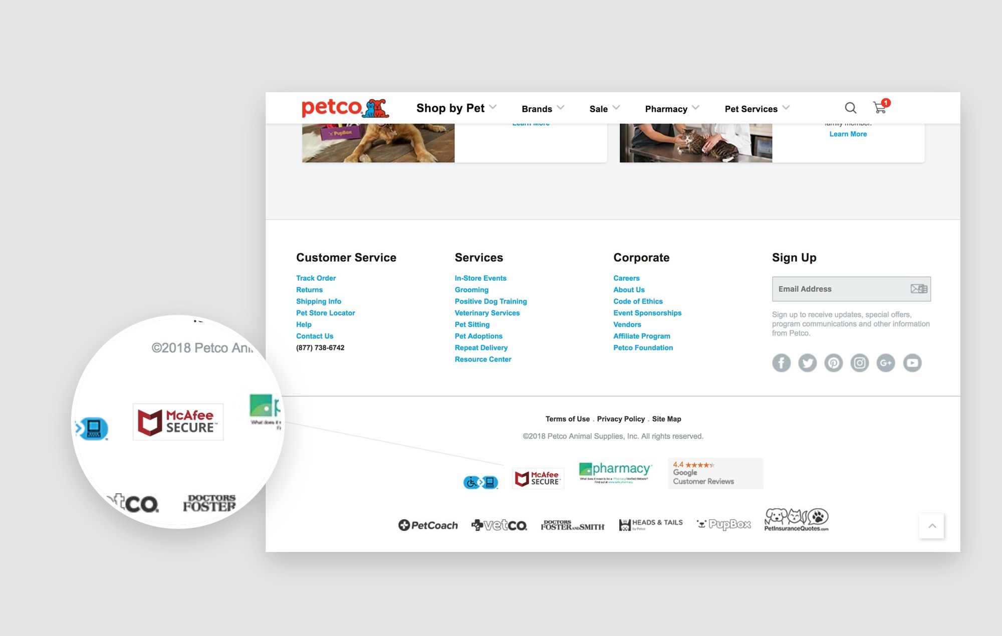 By placing the McAfee SECURE trustmark next to other badges that customers know—about their good reviews on Google and their safety in buying medicine for their pets—Petco associates their brand with reliability and trustworthiness.
