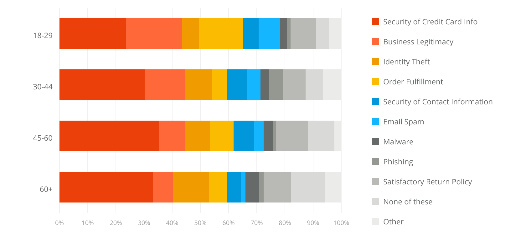 More 45-60 year olds said having their credit card information stolen was their biggest concern when shopping online, with 35% reporting this concern while only 24% of 18-29 year olds reported the same. Older generations often have more spending power than younger ones, so it could be that they have more to lose and hence are more worried about jeopardizing their finances.