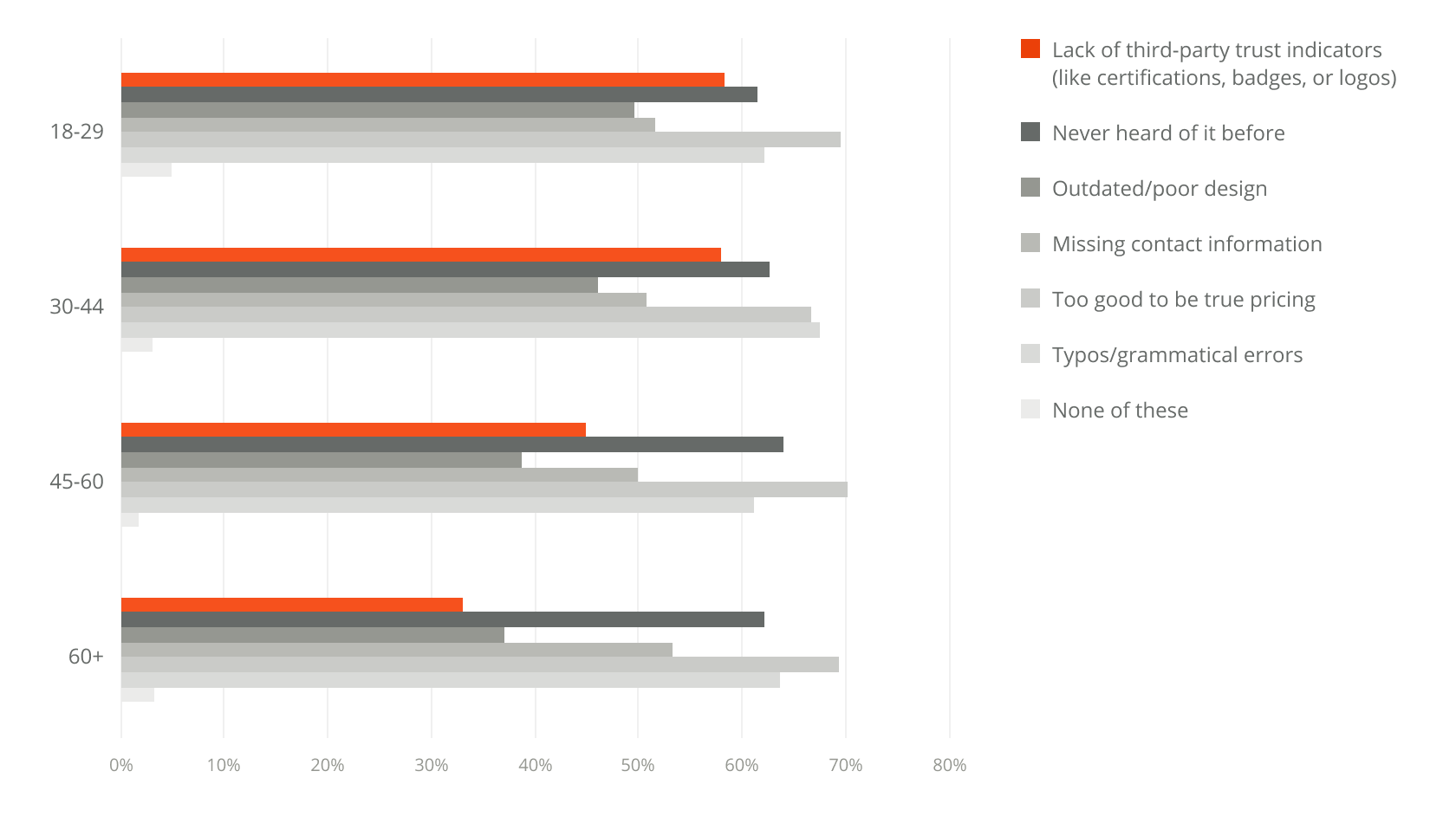 We asked consumers what causes them to be concerned that a site might be a fraudulent business and 58% of respondents aged 18-44 said lack of third party trust badges. About 45% of those aged 45-60 and 33% of those 60+ said the same. This tells us that younger generations want claims made by sites to be backed by a trusted third party. It could also mean that older generations may not be as familiar with what trust badges actually signify.