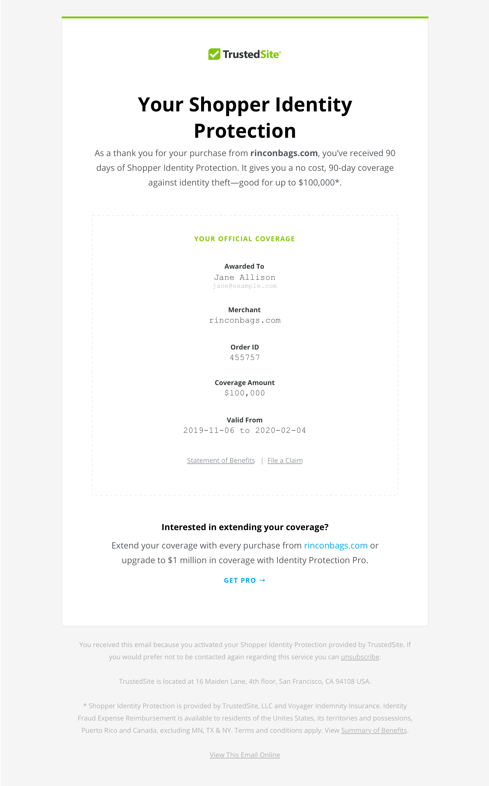 Addresses concerns about identity theft and data protection by showing qualified customers that they are covered with $100,000 Shopper Identity Protection.