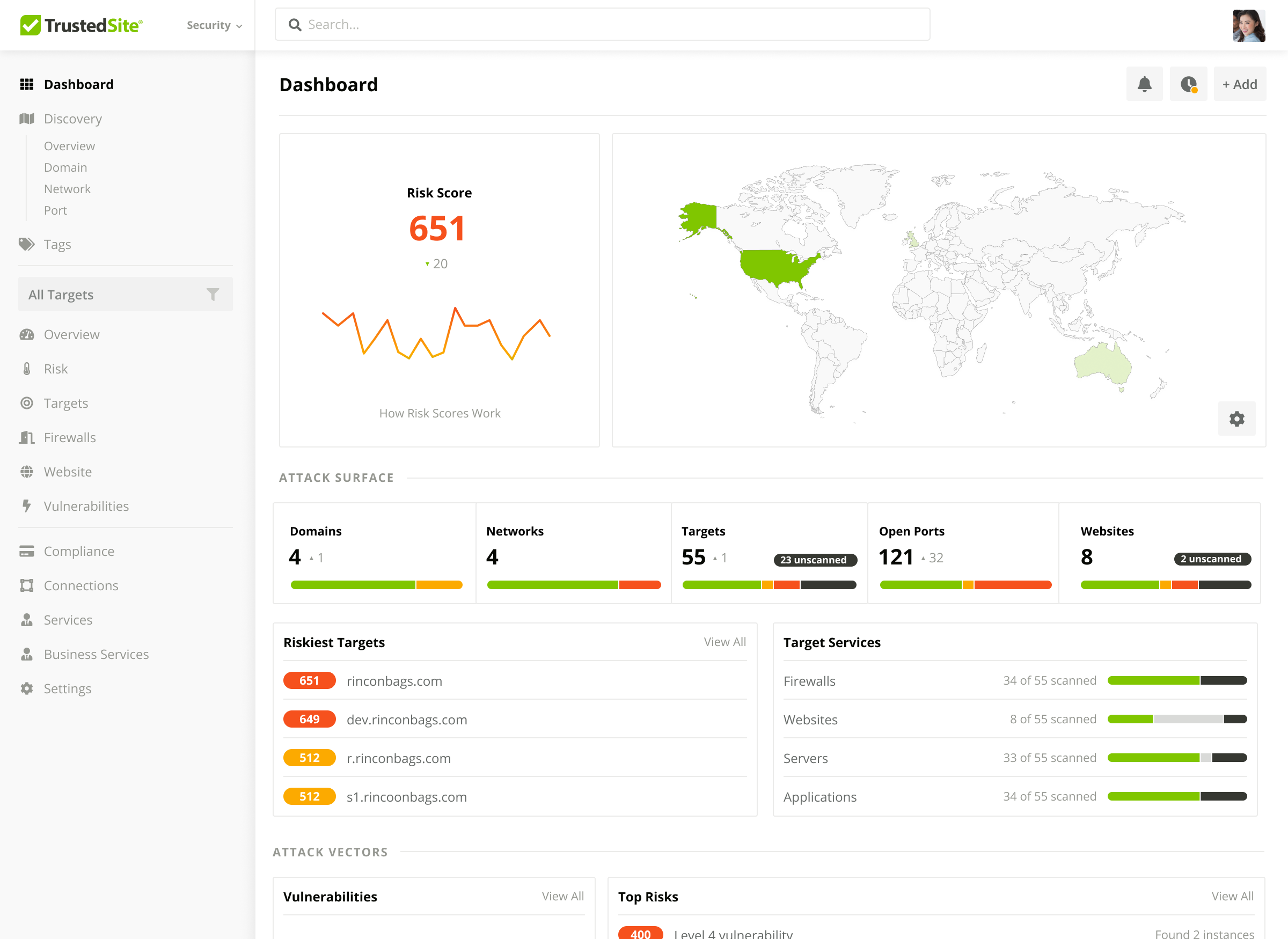 Big improvements to your security dashboard have arrived. First and foremost, you’ll see your account level risk score, along with a map of the locations where your assets exist. In the Attack Surface section, you’ll see your different types of assets broken down by risk, along with a list of riskiest targets and a list of services that you have applied to your targets. In the Attack Vectors section, you’ll see what issues are contributing most to your risk score. You’ll also see the status of other TrustedSite services you may be utilizing, like PCI Compliance and Penetration testing, along with a list of our recommendations for how to reduce risk in your account. These improvements should provide you with better guidance on where to focus your attention and remediation efforts.