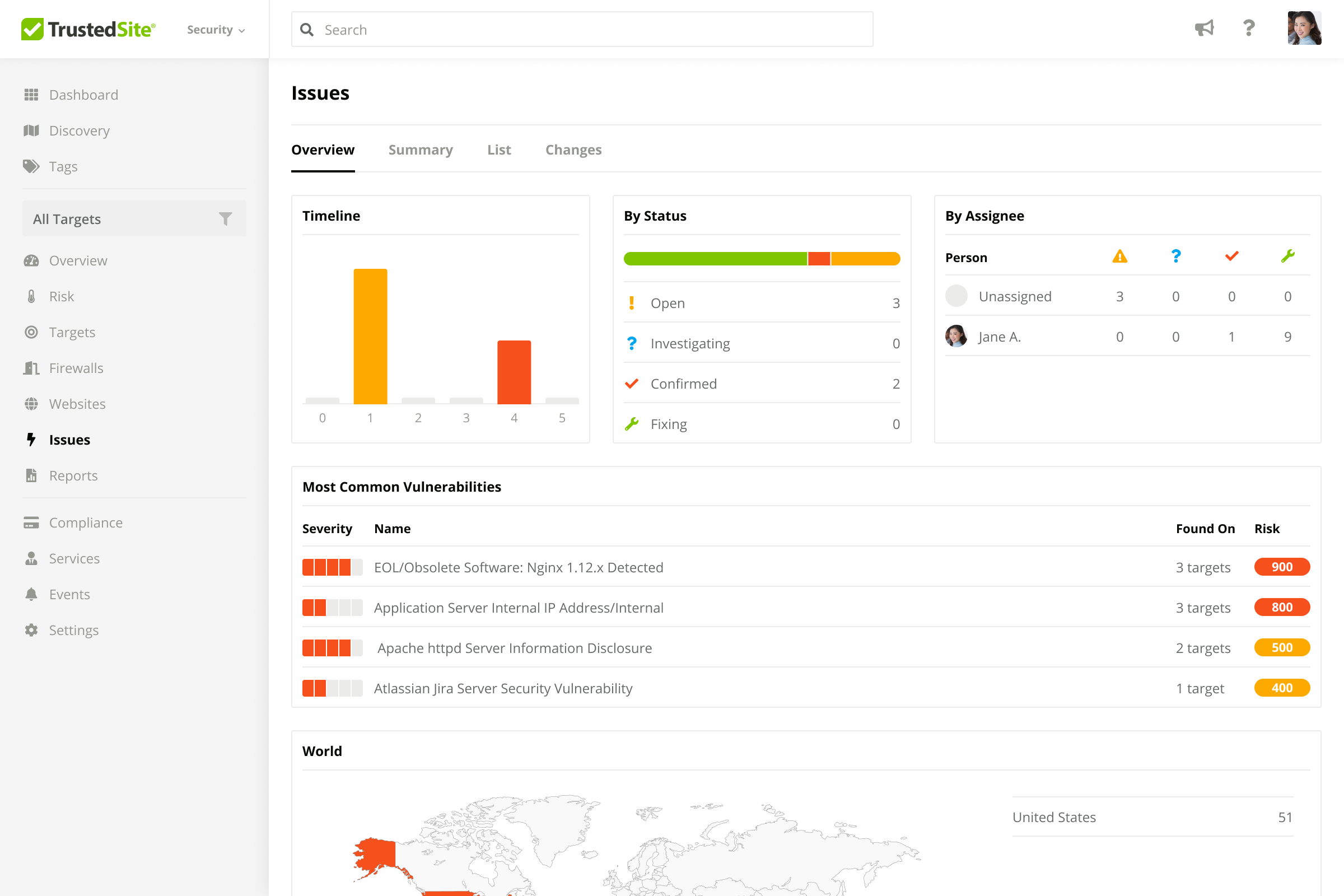 To review all issues in your account at a glance, head to the new Issues overview page where you’ll see them broken down by severity, status, and assignee, along with a list of the highest risk issues.